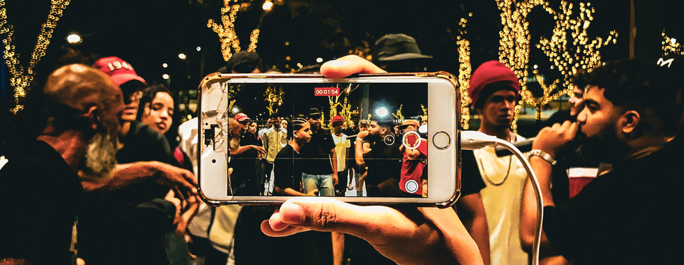 Movimento cultural que tem origens na década de 1970, no Bronx, em Nova York - Estados Unidos, o hip hop chega ao Brasil primeiro em São Paulo, ainda na década de 1980. O movimento que compreende diferentes formas de expressão artística como músicas de rap, grafite, breakdance e a presença de DJ, também deu origem às chamadas batalhas de rima, que são justamente o encontro, em espaço urbano, onde grupos de MCs desafiam-se na disputa de rimas afiadas, com criatividade e persuasão lírica.